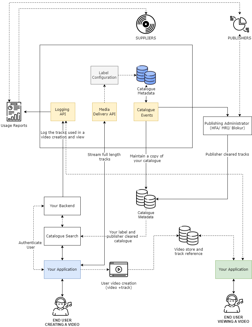 Once a video has been created by a user, both the track snippet and video should be merged into a single asset and stored within your own infrastructure. A reference to the MassiveMusic Track ID should also be associated with this asset as this is required for reporting purposes each time the video is viewed by one of your users.